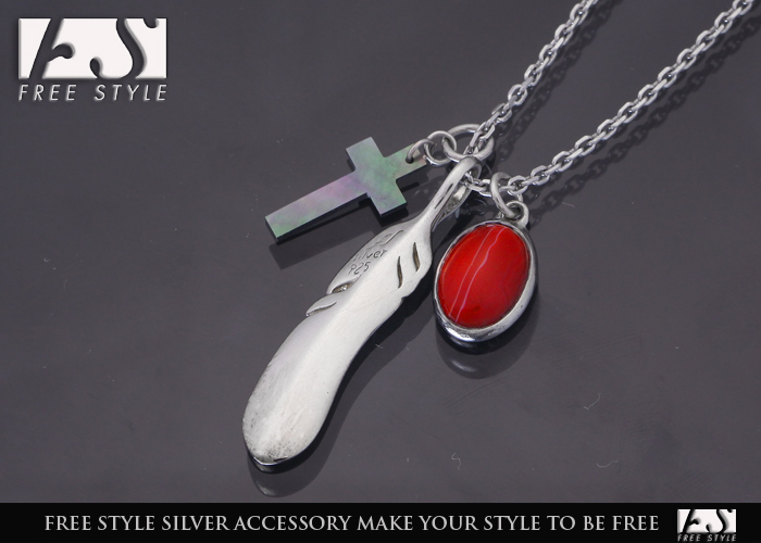 フェザーとブラックシェルのクロスにオーバル型のレッドレースアゲートを融合した圧倒て存在感を放つ超人気シルバーペンダント。