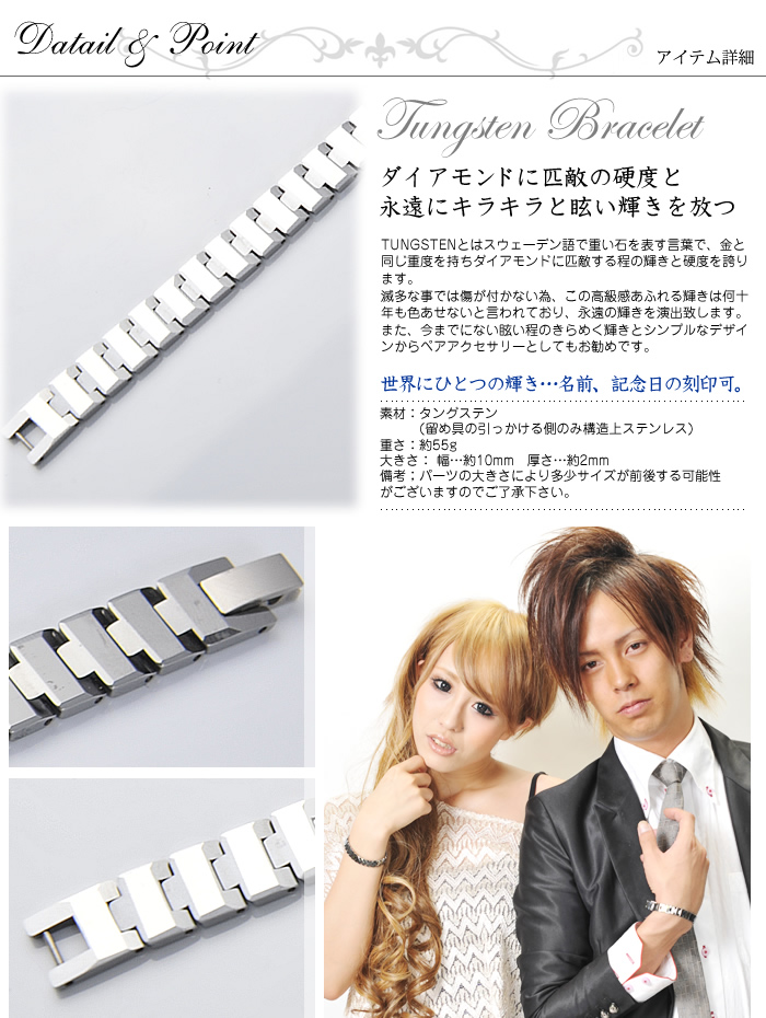 ■タングステンとは,スウェーデン語で重い石を表す言葉で、金と同じ重度を持ち,ダイヤに匹敵するほどの硬度を誇り,キラキラした鏡面の輝きを放ちます。 滅多な事では傷が付かない為,この高級感あふれる眩い輝きは何十年も色あせないともいわれております