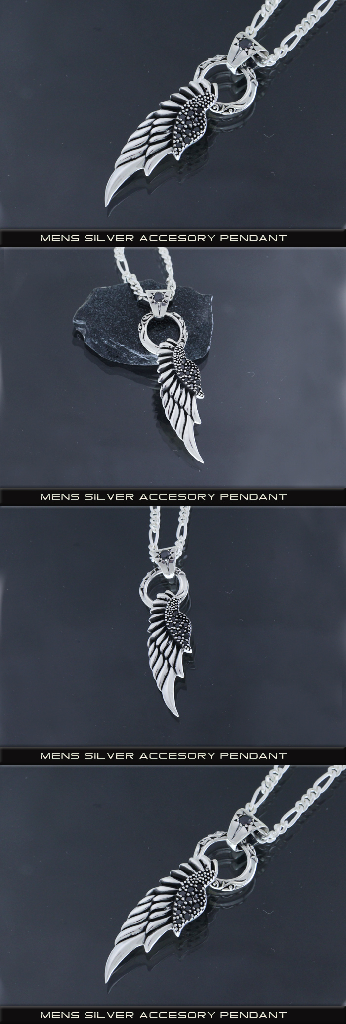 リングに唐草をあしらったフェザーとの2連フォルムは見る者を圧倒!フェザーのシルエットにはブラックジルコニアが漆黒に輝く逸品のシルバーペンダント。 羽の細部まで彫金されたディテールは胸元でクールな存在感です。 使い込んでこそ味が出るシルバーアクセでこれからの時代を刻み込む まさにオンリーワンのシルバーアクセサリーです。