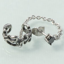 透かしの唐草の流れるような神秘的なフォルムにチェーンをセットし、ダイヤに匹敵するキラキラの輝きを持つモテ系定番の漆黒のブラックジルコニアをセットした存在感抜群のフォルム。リングのイヤカフは着用場所の自由度を発揮!!ユニセックスなので男女兼用フォルムの気軽に身につけられる耳元に存在感を主張するイヤーカフスピアスです。