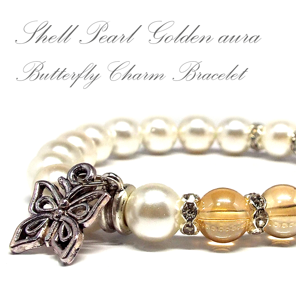 キュートなチャームバタフライがカジュアルにもガーリースタイルにもぴったりです! ゴールデンオーラとシェルパールを ふんだんに使用した贅沢感満載のブレスレット♪ ゴージャスな雰囲気も持ちつつ、品良くお洒落にお付けいただけます☆ ○女性らしさUP☆ 女性らしく清潔感たっぷりのブレスレット!! ブレスレット1つで女性らしさを作ってくれるモテブレス♪? ファッションセンス抜群のパワーストーンブレスレットです。 自分へのご褒美・プレゼントにも大変喜ばれます。