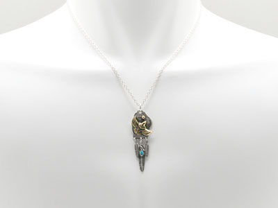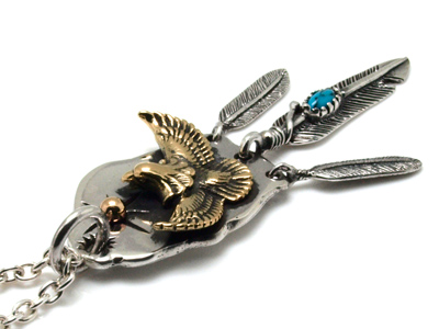 大きめのゴールドのイーグルが存在感抜群。コンチョの下に3枚のフェザーモチーフが揺れるネイティブ系ペンダントです。ターコイズがさり気ないアクセントを利かせます。 先進的なイメージを主張する存在感抜群のシルバーペンダントです。 プレゼントやギフトにも大変喜ばれる本物志向の シルバーアクセサリーブランドRoyal Justyのメンズシルバーペンダントはどんな装いにも キマルのであなただけのオンリーワンを発揮していろいろな場面で大活躍してくれます!